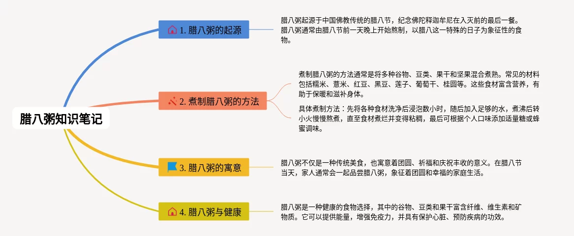 21张腊八粥的思维导图.合集,腊八粥的思维导图.,内容涵盖目录、1. 什么是腊八粥、2. 腊八粥的制作方法、3. 腊八粥的意义和传统习俗等4个部分,21张高清晰可打印,每张思维导图都非常漂亮,每张图片均高清晰可打印。