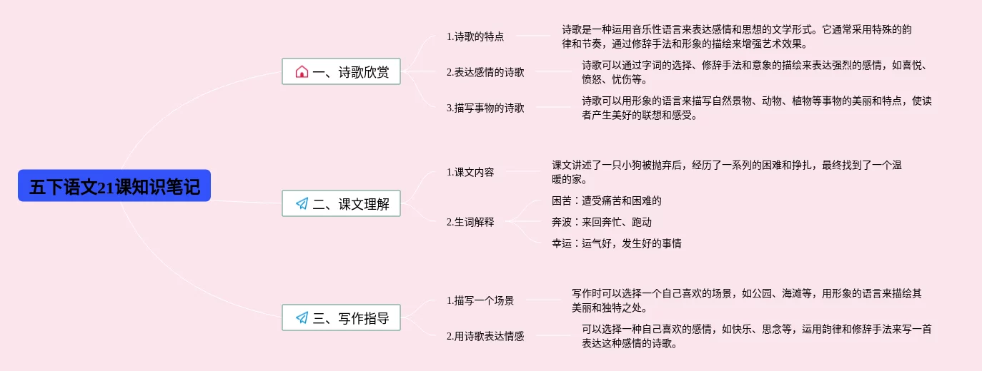 25张五年级下册语文21课思维导图合集,五年级下册语文21课思维导图,内容涵盖诗歌欣赏、课文理解、写作指导等3个方面,25张精选版,每张思维导图都非常简单,每张图片均精选版。