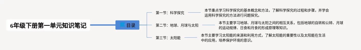 21张6年级语文下册第一单元思维导图合集,6年级语文下册第一单元思维导图,内容涵盖目录、第一节科学探究、第二节地球、月球与太阳、第三节太阳能等4个部分,21张精选版,每张思维导图都非常简单,每张图片均精选版。