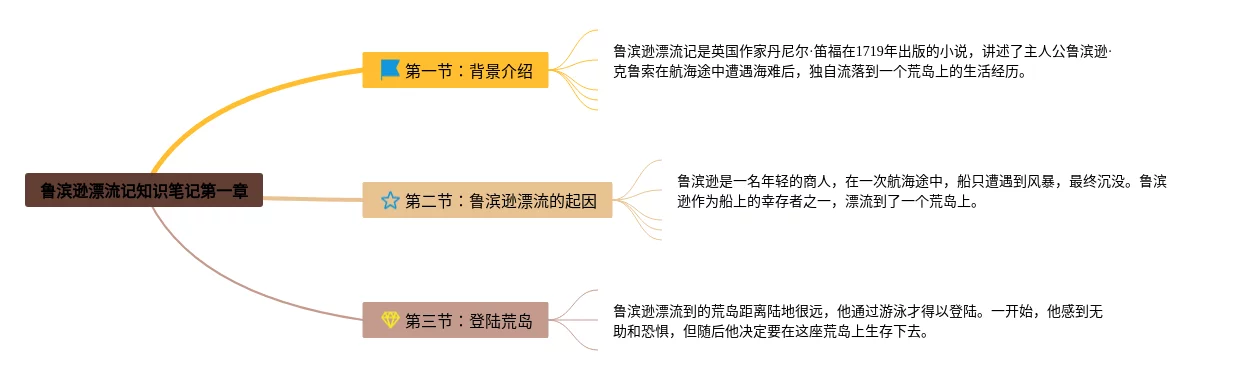 20张鲁滨逊漂流记第一章思维导图汇总,鲁滨逊漂流记第一章思维导图,内容涵盖作品简介、主要内容、人物、生活轨迹图、回到英国等11个方面,20张高清晰可打印,每张思维导图都非常漂亮,每张图片均高清晰可打印。