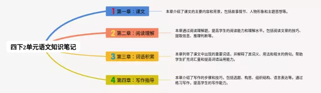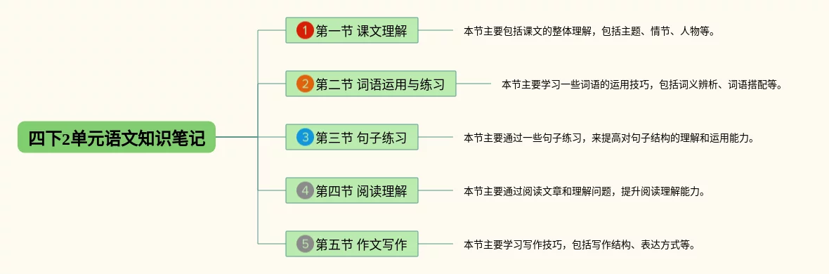 25张四下2单元语文思维导图合集,四下2单元语文思维导图,内容涵盖第一节 课文理解、第二节 词语运用与练习、第三节 句子练习、第四节 阅读理解、第五节 作文写作等5个方面,25张附下载,每张思维导图都非常简单,每张图片均附下载。