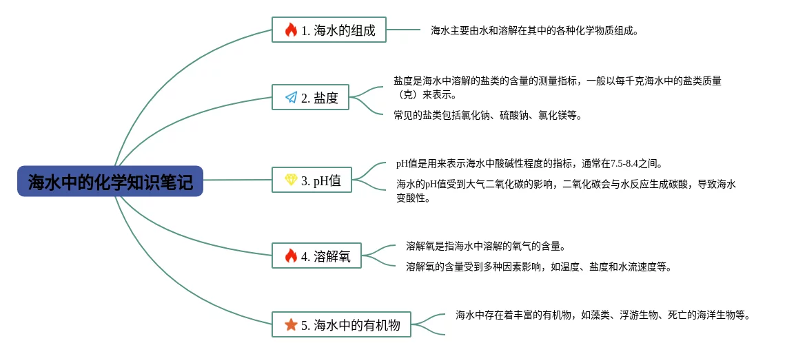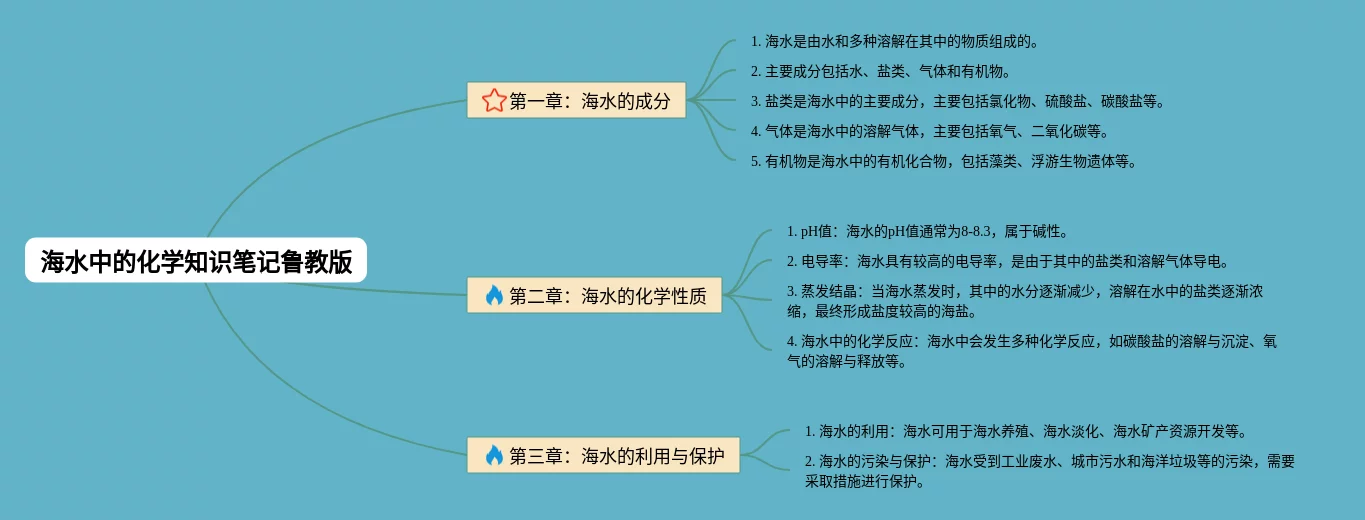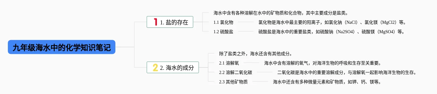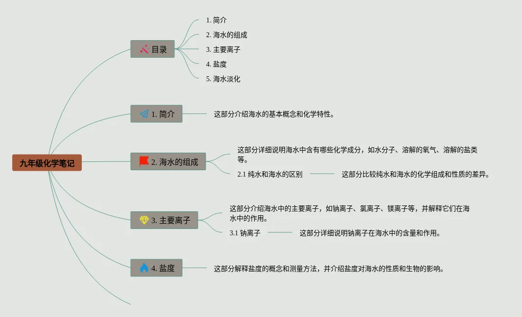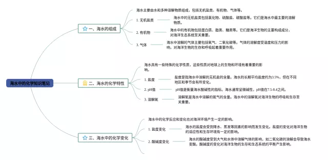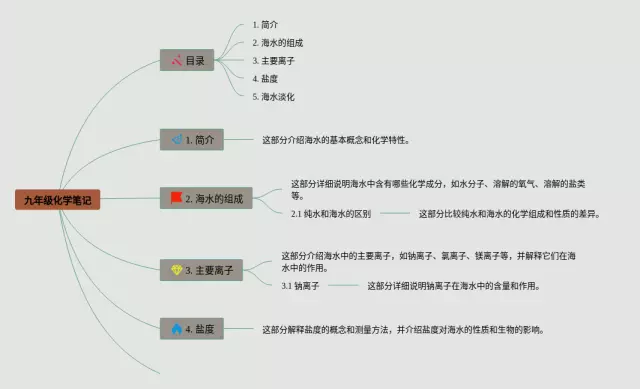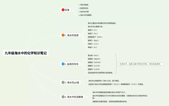 21张九年级海水中的化学思维导图汇总,九年级海水中的化学思维导图,内容涵盖目录、介绍、海水的成分、盐度、主要离子等6个部分,21张精选版,每张思维导图都非常清晰,每张图片均精选版。