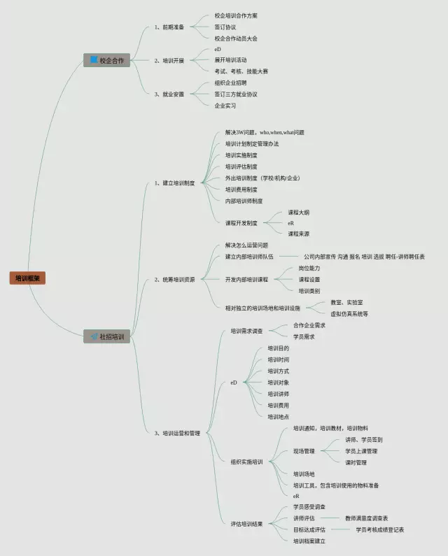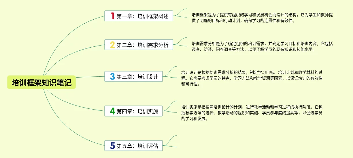 21张培训框架思维导图合集,培训框架思维导图,内容涵盖第一章培训框架概述、第二章培训需求分析、第三章培训设计、第四章培训实施、第五章培训评估等5个知识点,21张附打印高清版,每张思维导图都非常简单,每张图片均附打印高清版。