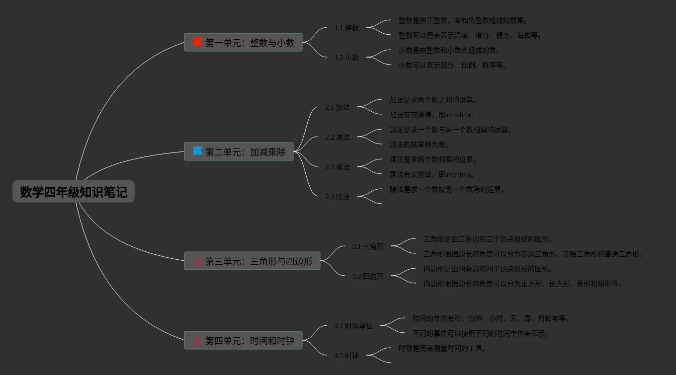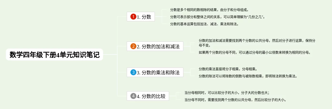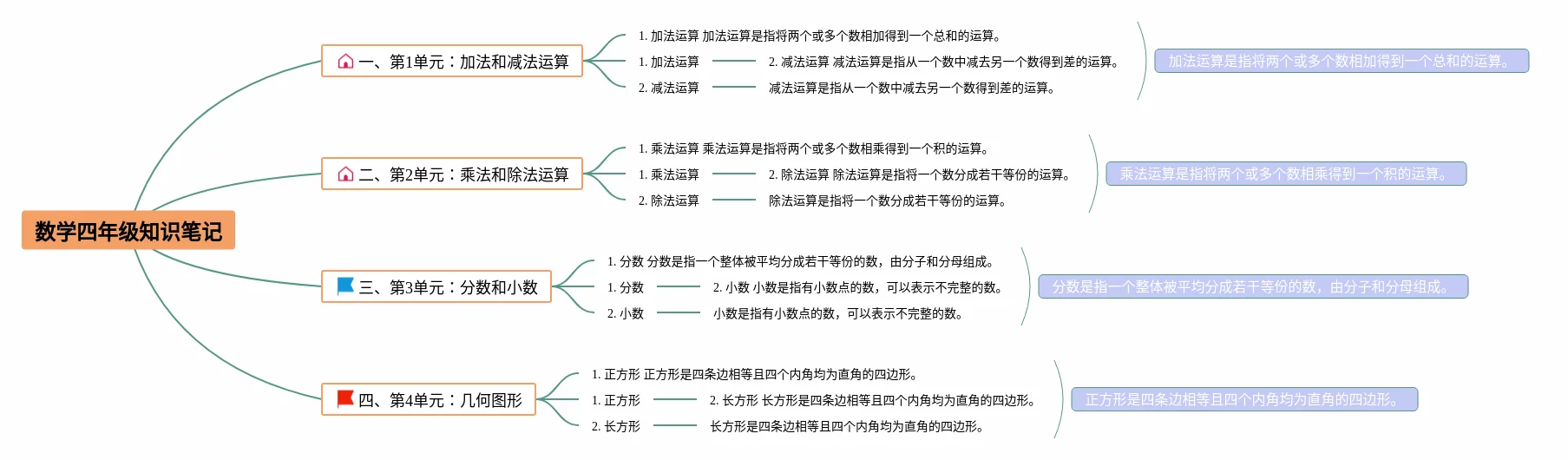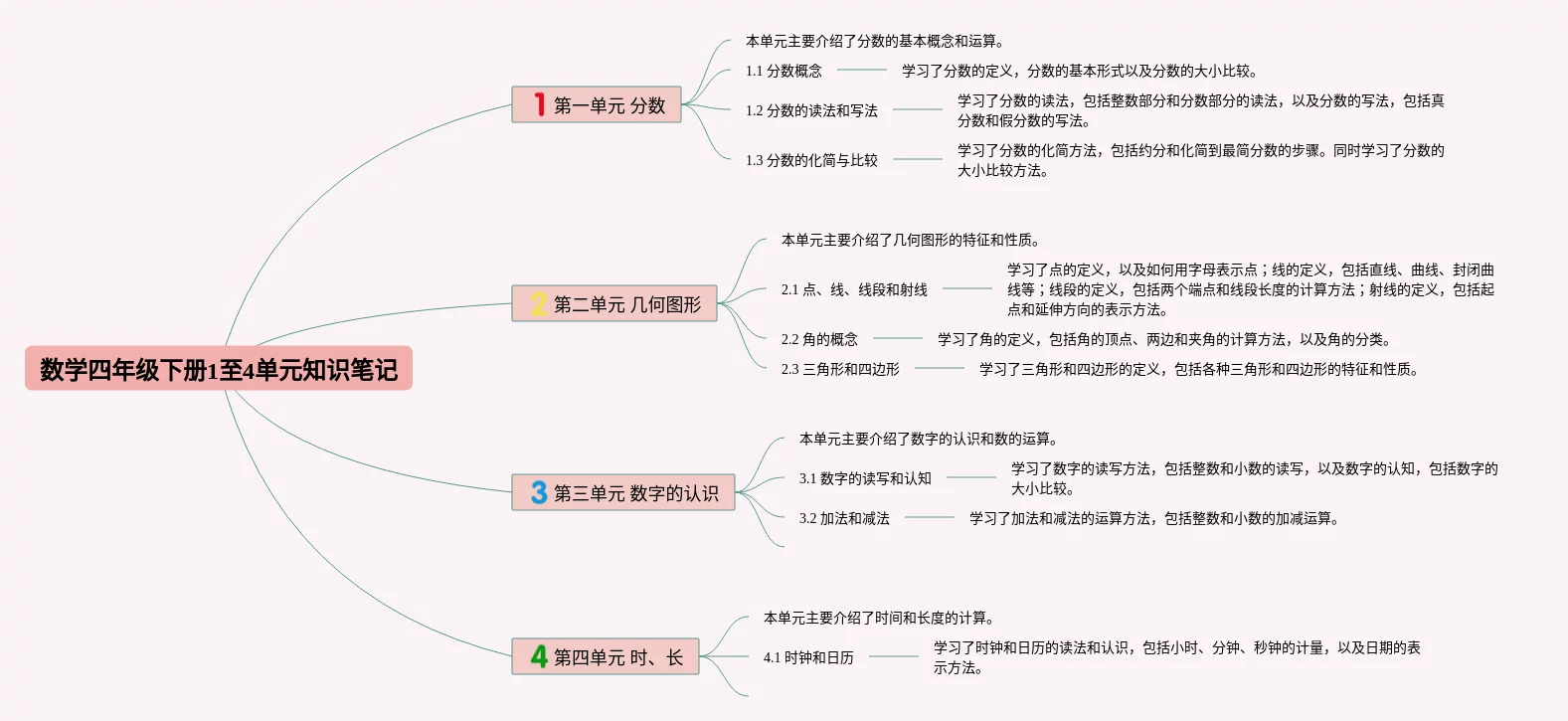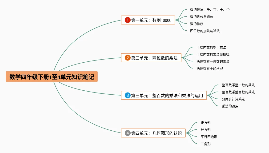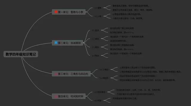 20张数学四年级4单元思维导图汇总,数学四年级4单元思维导图,内容涵盖第一单元 分数、第二单元 几何图形、第三单元 数字的认识、第四单元 时、长等4个要点,20张高清版,每张思维导图都非常简单,每张图片均高清版。