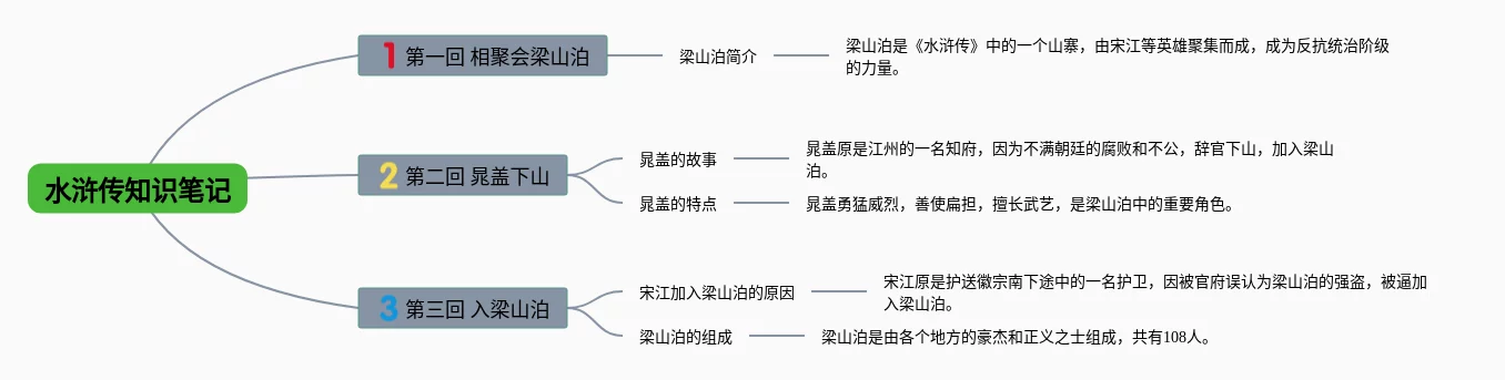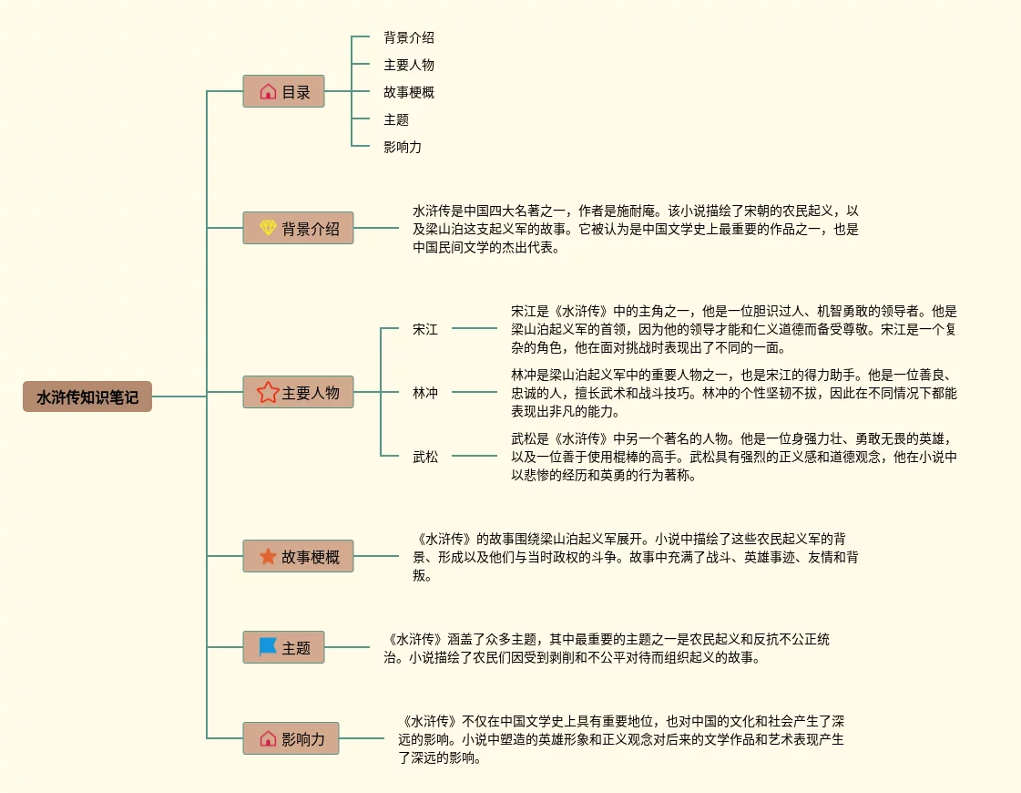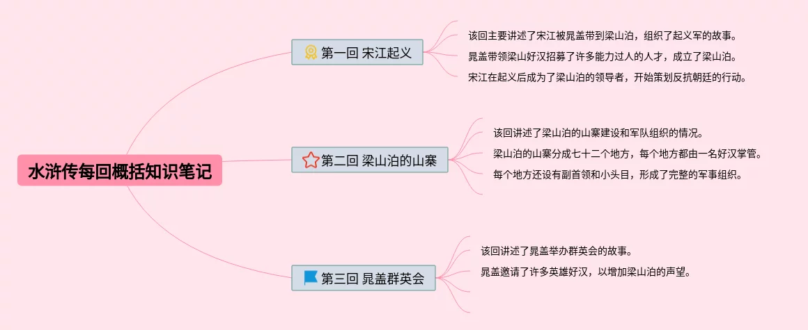 22张水浒传思维导图内容概括汇总,水浒传思维导图内容概括,内容涵盖第一回 宋江、第二回 梁山泊的山寨、第三回 晁盖群英会等3个要点,22张高清晰可打印,每张思维导图都非常漂亮,每张图片均高清晰可打印。