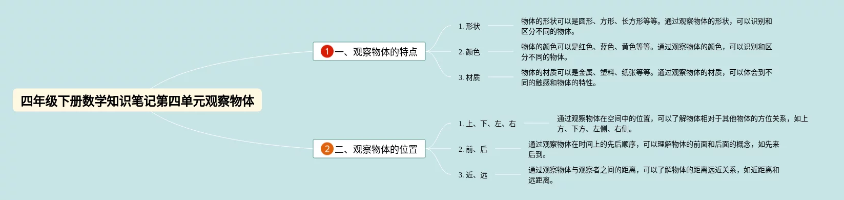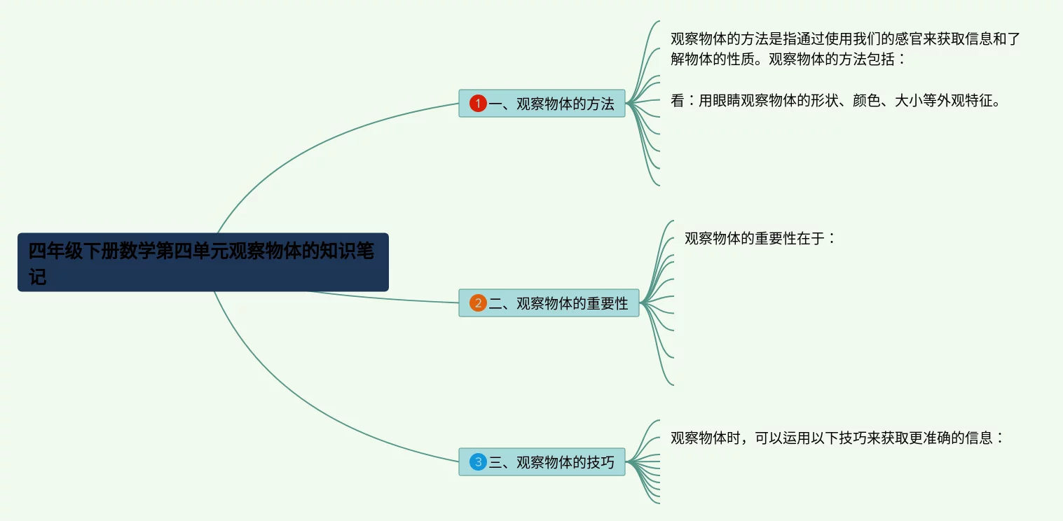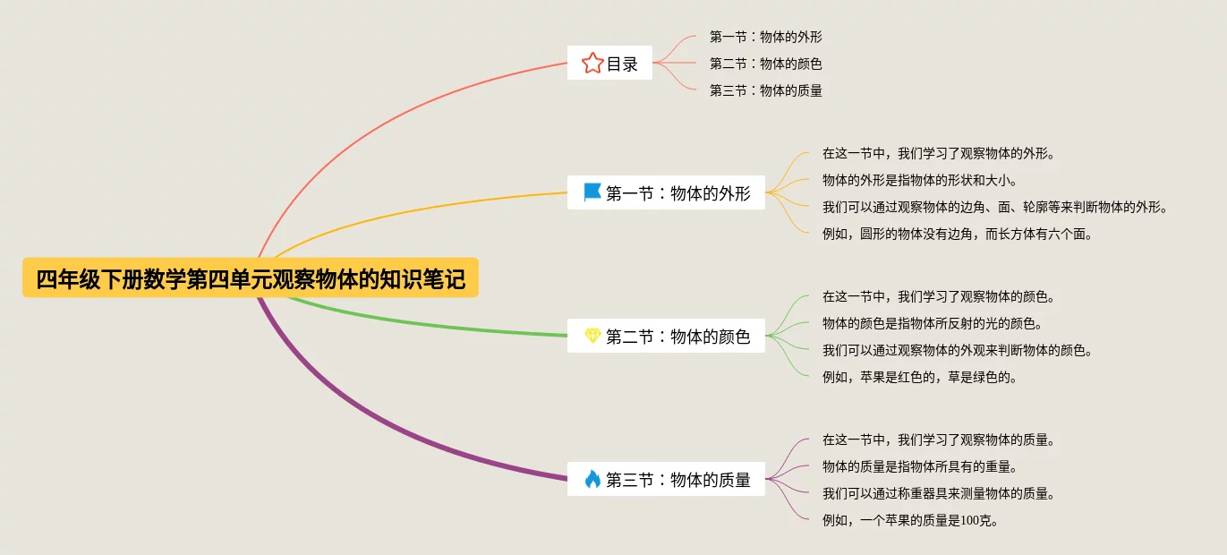 22张四年级下册数学第四单元思维导图观察物体汇总,四年级下册数学第四单元思维导图观察物体,内容涵盖目录、1. 引言、2. 物体的性质、3. 物体的变化等4个要点,22张高清晰可打印,每张思维导图都非常清晰,每张图片均高清晰可打印。