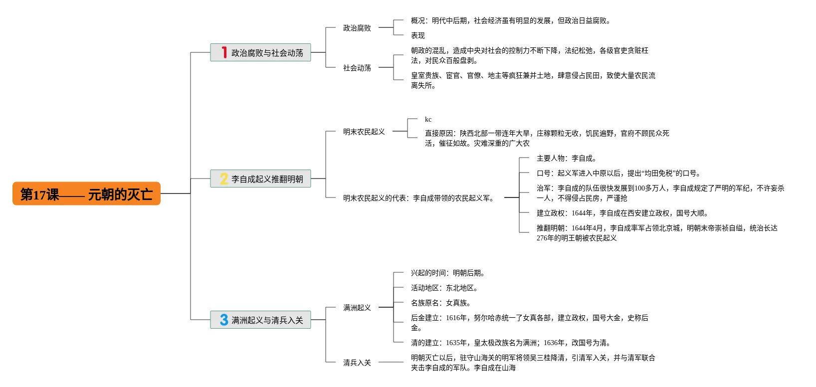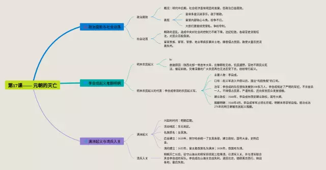 22张第17课的思维导图汇总,第17课的思维导图,内容涵盖与社会动荡、李自成推翻明朝、满洲兴起和清军入关等3个知识点,22张精选版,每张思维导图都非常简单,每张图片均精选版。