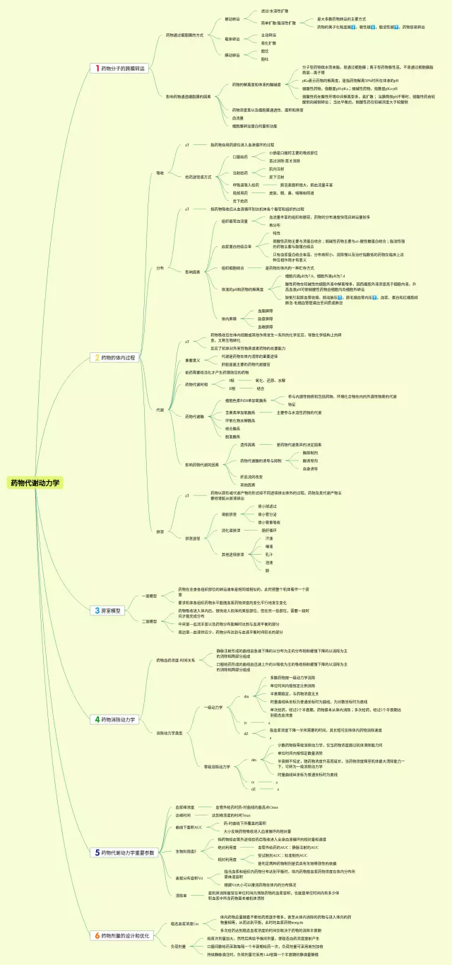 22张药物代谢动力学思维导图汇总,药物代谢动力学思维导图,内容涵盖药物分子的跨膜转运、药物的体内过程、药物消除动力学、药物代谢动力学重要参数、药物剂量的设计和优化等5个部分,22张可下载,每张思维导图都非常清晰,每张图片均可下载。